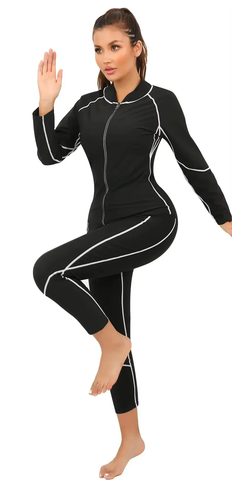 • بدلة بأكمام طويلة :يوفر التصميم ذو الأكمام الطويلة تغطية إضافية ودفء، مما يجعله مثاليًا للأنشطة الرياضية الخارجية.