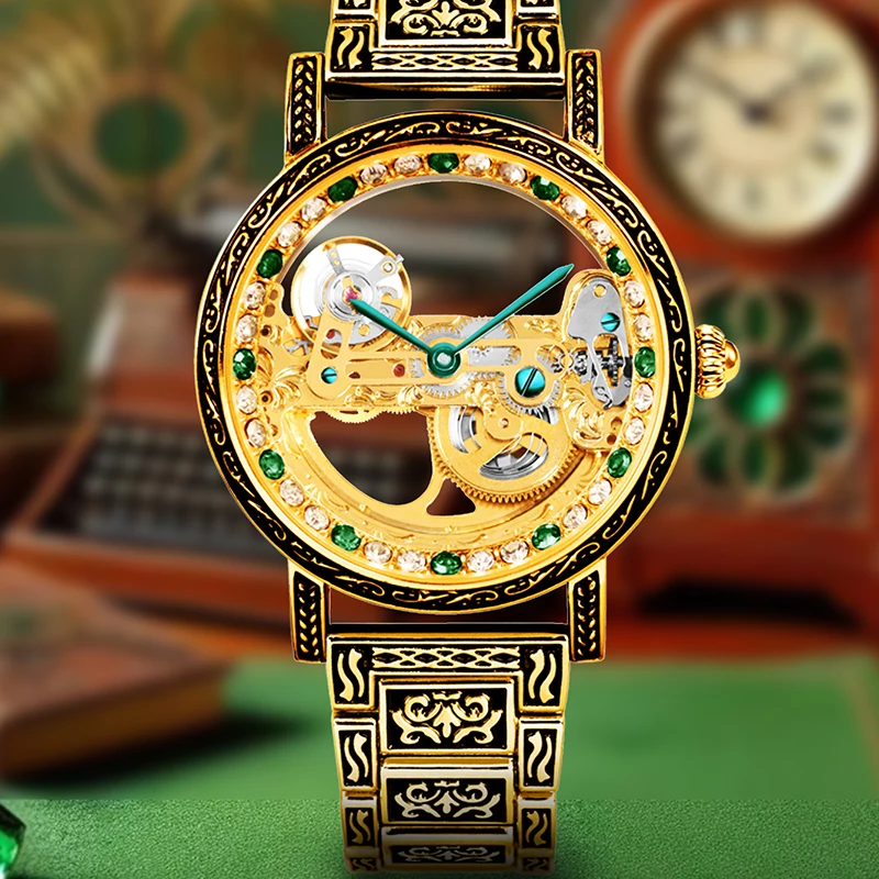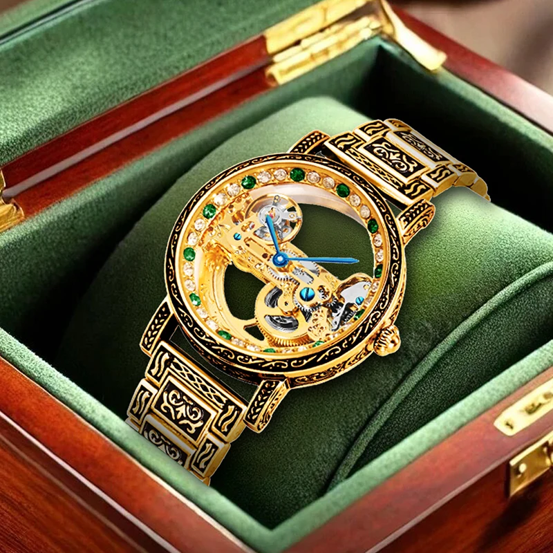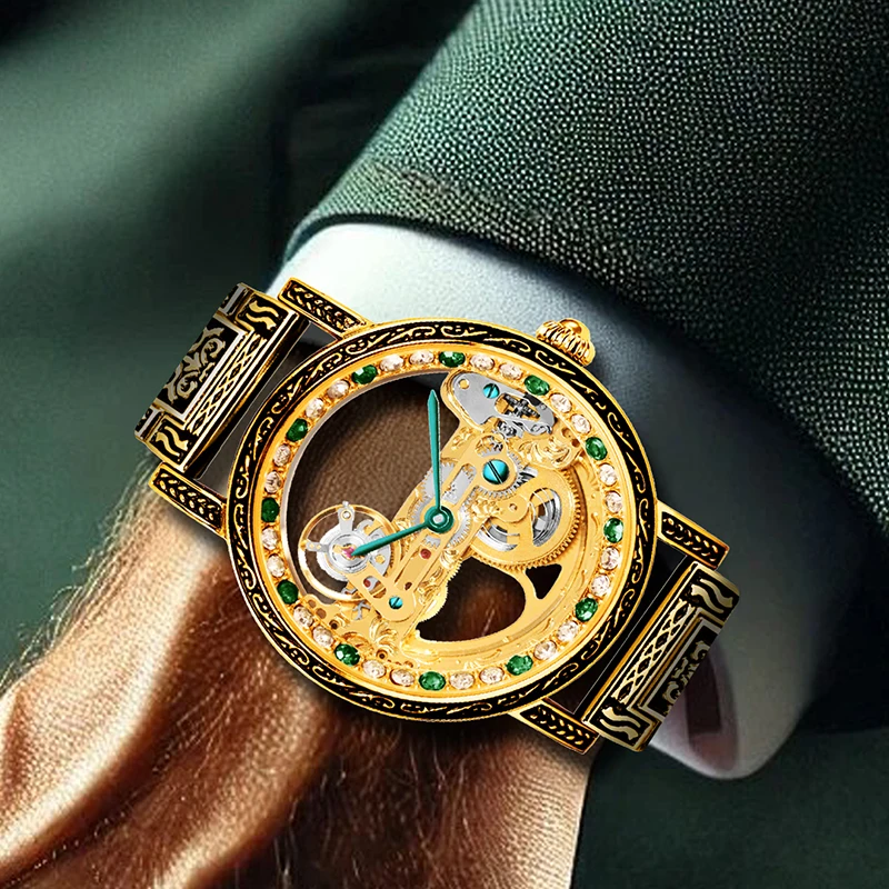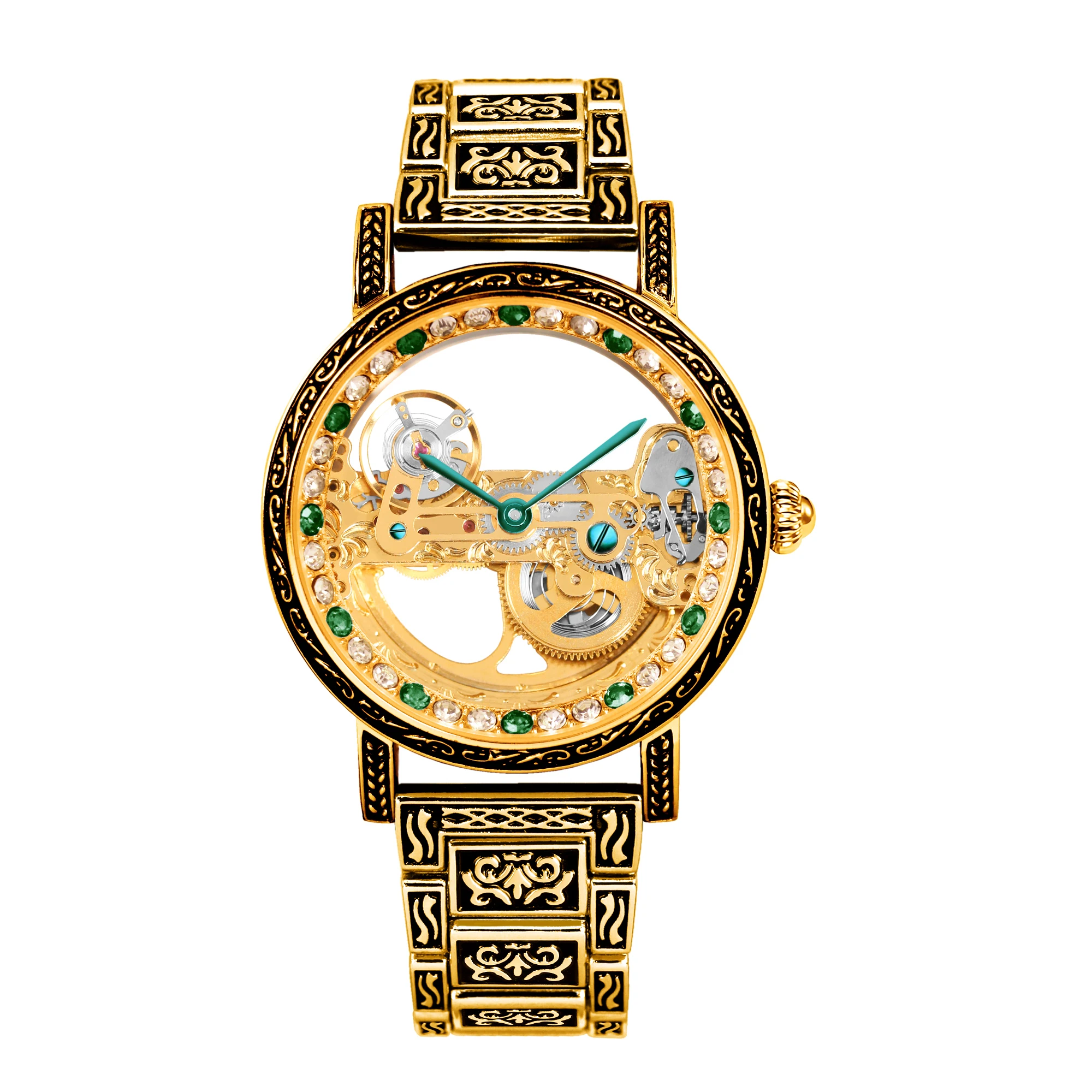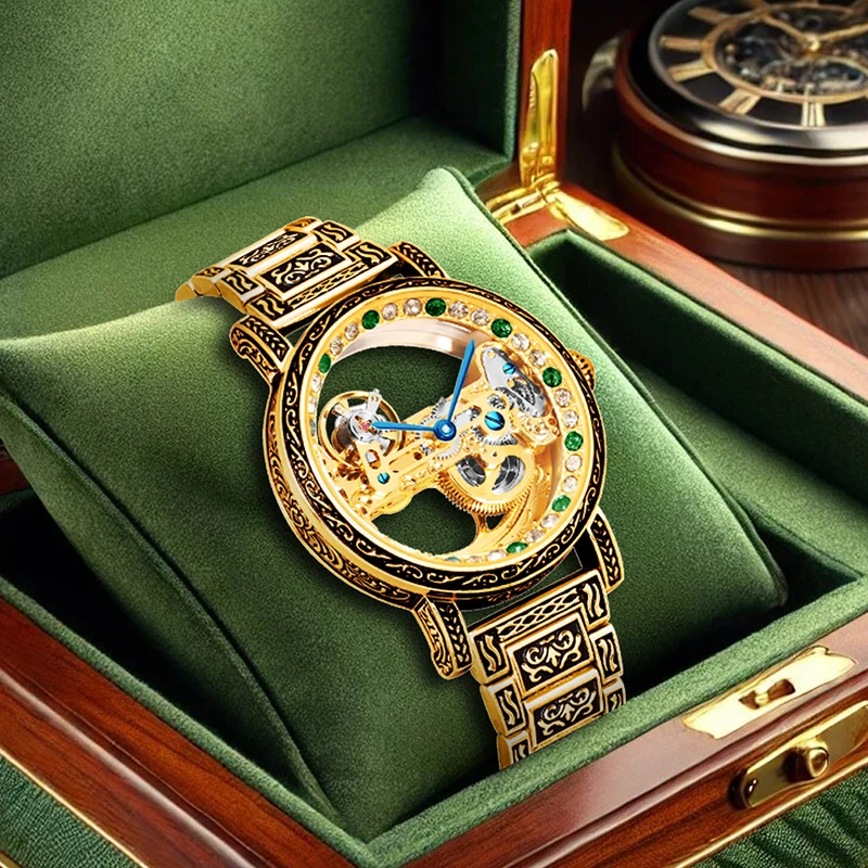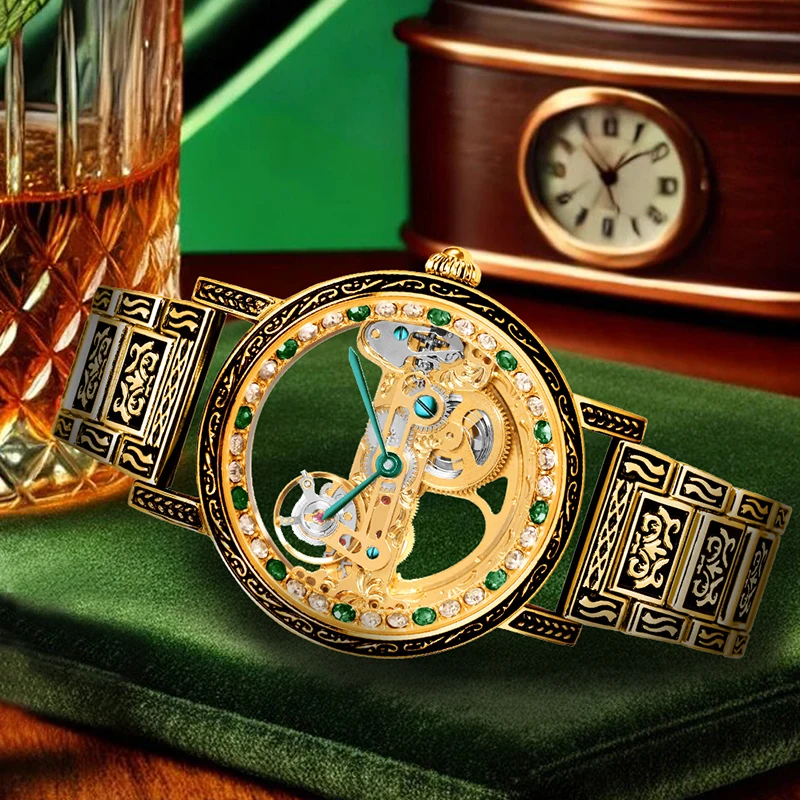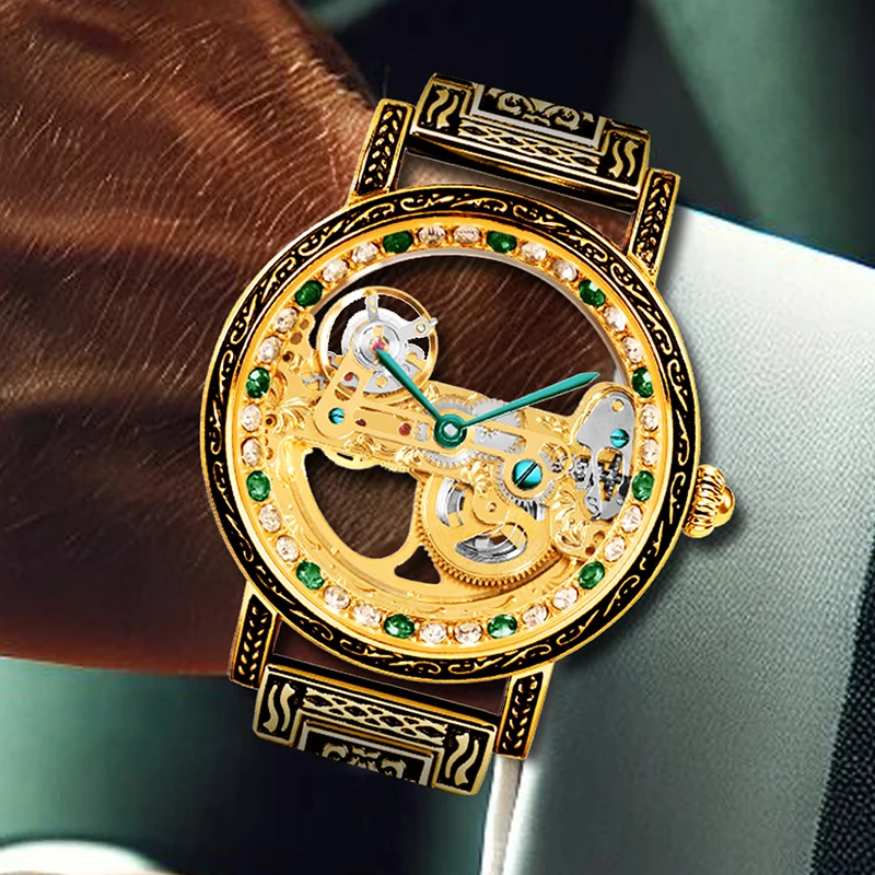 ساعة ميكانيكية أوتوماتيكية بحزام من الفولاذ باللونين الأسود والذهبي للرجال على الوجهين