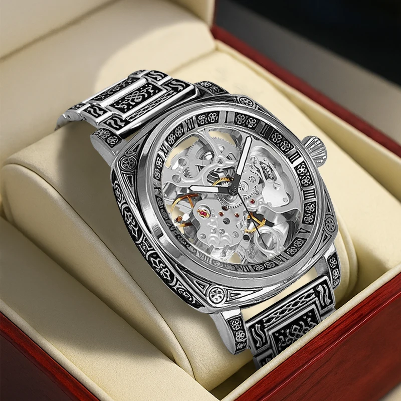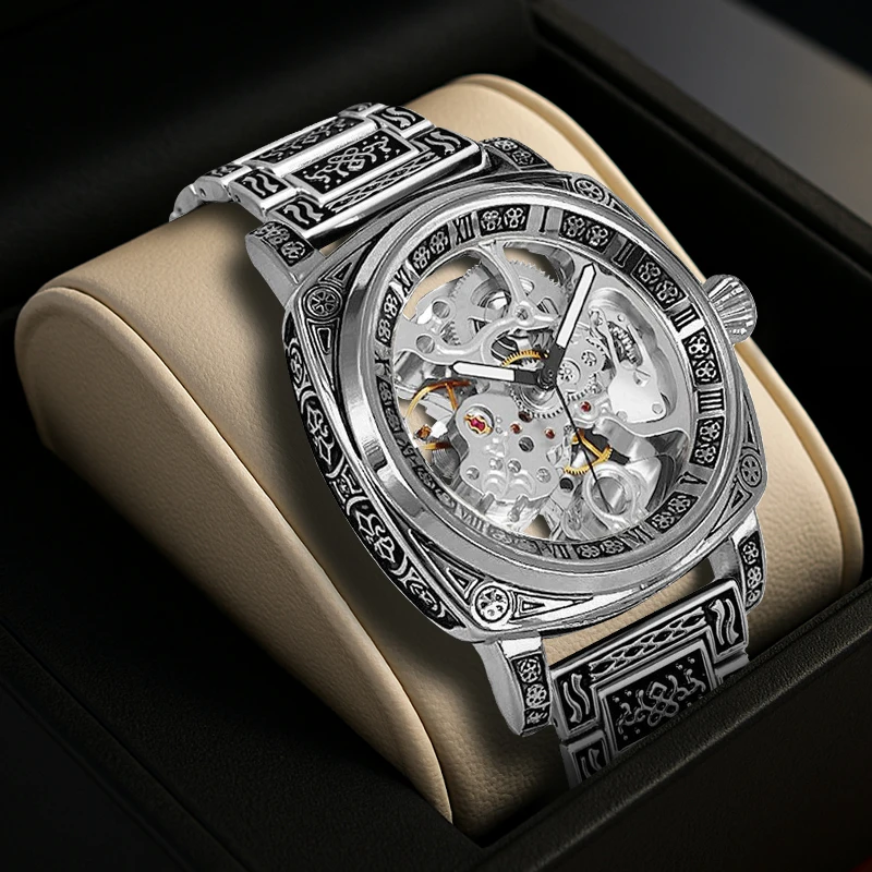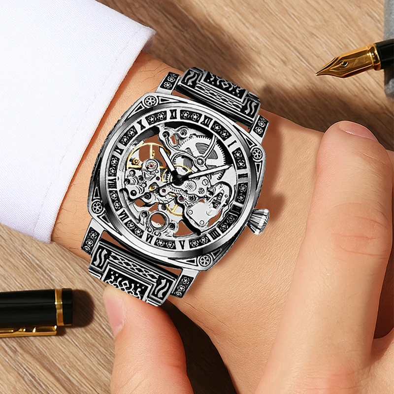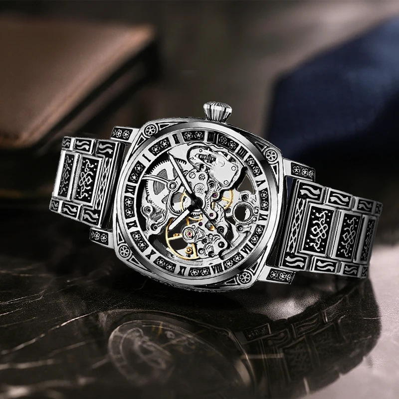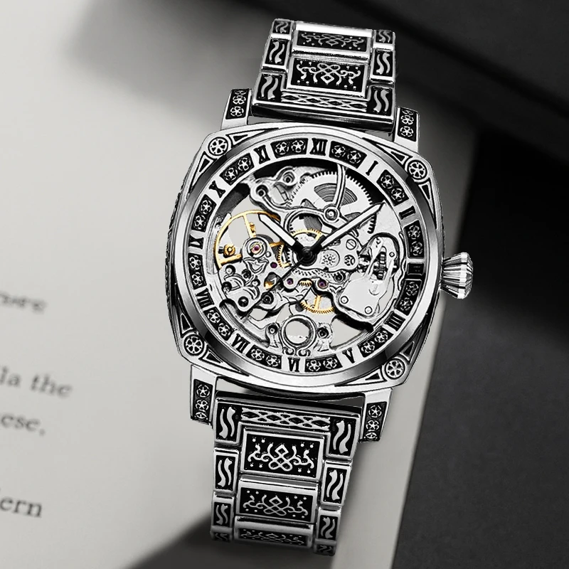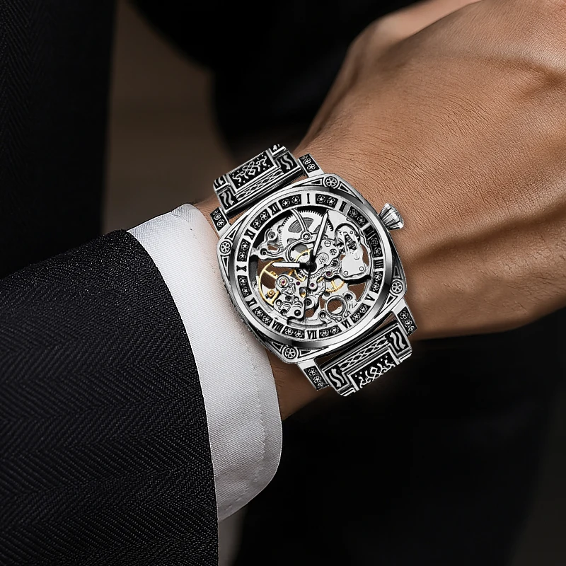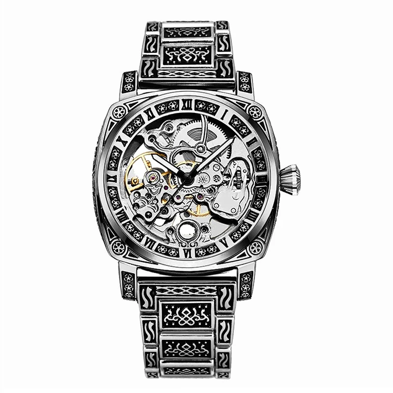 ساعة ميكانيكية أوتوماتيكية أوتوماتيكية بهيكل عظمي تناظري أنيق للرجال منحوتة باللون الفضي
